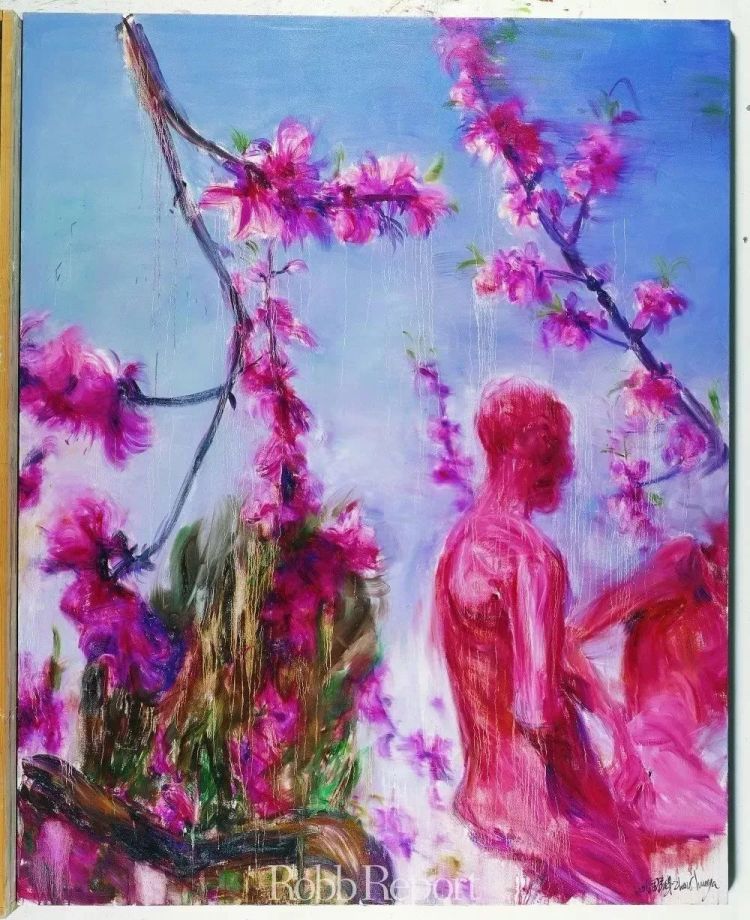 桃花系列的创作亦始于偶然。周春芽在一次春游中被漫山盛放的桃花打动,萌生了创作的念头。而后桃花系列同样成为了艺术家创作生涯中的重要代表作品。在这系列作品中,我们看到艳丽的色彩在画布上奔涌、流淌,旺盛的、鲜活的,动荡着一池春色,绽放着无法遏制的欲望。作品《桃花风景系列 2006——蓝色的天空》中,红人与桃花一同在春风中肆意共舞,扔掉了含蓄的面纱,将生命的绚烂、张扬、野性盛放到了极致。周春芽并不讳言画中的色与情,“我的画都是关于激情和浪漫的,欲望是人类的一个组成部分,是我们与生俱来的东西。更重要的是,我们对性的感情和欲望都是活力的体现,象征着全盛时期的生命。”