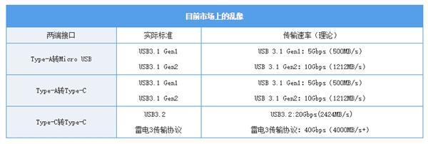 最开始的时候,USB3.0、USB 3.1 Gen1、USB 3.1 Gen2都是蓝色的Type A接口,另一端接口则是看所接设备的需要。而自从USB Type-C接口面世以来,整个市场就更混乱了。