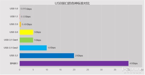 本来USB Type-C是为了USB 3.2(传输速率20Gbps)而出生的,需要连接设备都是USB Type-C才能实现USB 3.2标准。也因为多触点等优势被雷电传输协议所看重,雷电3传输协议(40Gbps)可以搭载在USB Type-C接口上,这也造就了USB Type-C高端高速的象征。