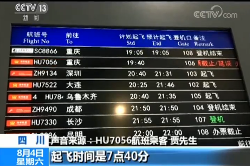 HU7056航班乘客 贾先生:它这个航班预定的起飞时间是7点40分,刚开始是延误到8点05分,8点05分的时候我们登过一次机,登完机以后就说这个天气飞不了,就又撤到候机楼里,最终起飞时间大概就是11点20到11点半之间。