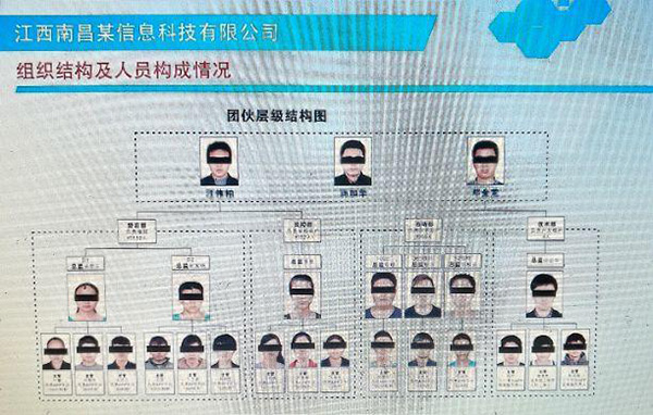 经民警调查,南昌市赤之顿信息科技有限公司由汤某、汪某、邓某3人为股东,该犯罪团伙呈树形结构,分5个层级,其中老总3人、总监7人、主管12人、组长和组员合计 192 人。至此,"5.21" 专案犯罪团伙组织架构清晰浮现,收网时机已经成熟。