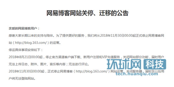 【环球网科技 记者 林迪】8月20日晚,网易博客发布公告称,2018年8月21日00:00起,将停止官方渠道客户端下载、新用户注册和VIP充值服务,关闭网站部分功能,届时用户无法上传日志、附件、图片、音乐等内容;无法进行评论。