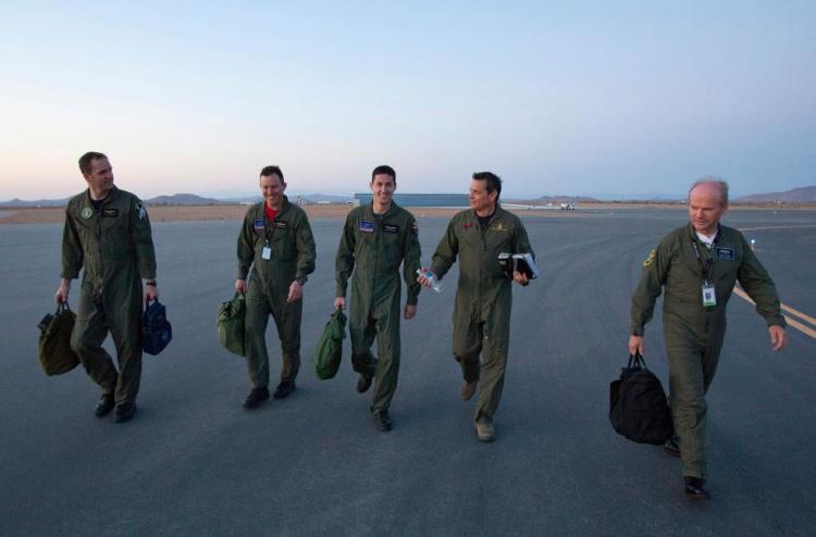 图示:从左至右:试飞员克林特⋅尼克尔斯(Clint Nichols)、迈克⋅阿尔斯伯里(Mike Alsbury)、布莱恩⋅梅斯勒(Brian Maisler)、马克⋅斯塔基(Mark Stucky)以及戴夫⋅麦凯(Dave Mackay)。照片拍摄于第一艘“太空船2号”进行第一次加力飞行测试之前。