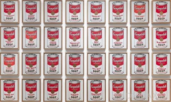 波普艺术的另一个特征就是以不断复制的形式呈现,作品通过丝网印刷印制出来排列在货架上,其实就是触手可及的消费艺术;而另一方面高度发达的商业社会中人们内在感情的冷漠、疏离感也由此表现。波普艺术的形式重于思想,但是它的出现也是为了消解思想,引起反思。