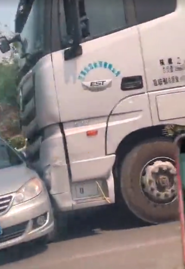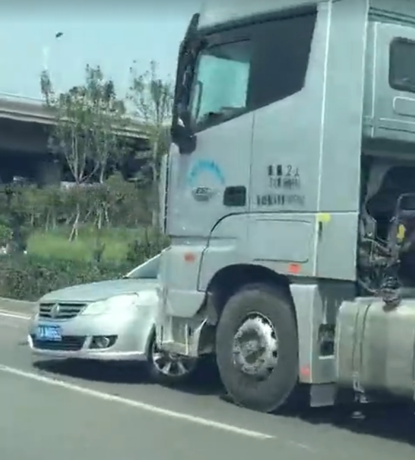 视频中,一辆正在行驶的大货车顶着一辆横在车前的小轿车前行,车内还有一名驾驶员及两名乘客。