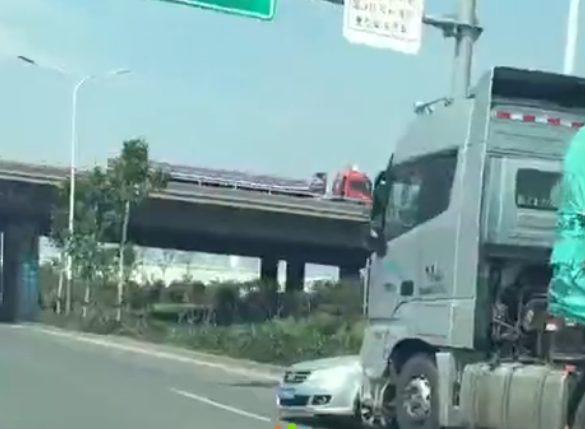 8月21日,济南历城区机场路附近,有过路市民拍下一段大货车顶着轿车跑的视频。