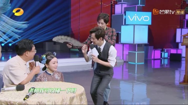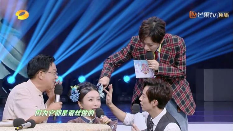 就比如在这期《快乐大本营》中,他想要触摸秦岚佩戴的绒花,先是礼貌地征得了制作老师的同意: