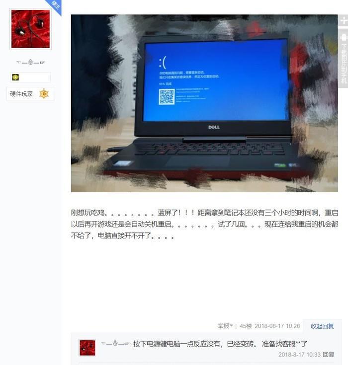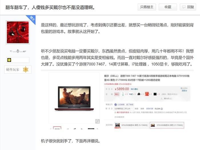 8月16日,该网友在“笔吧”发布了题为“翻车翻车了,人傻钱多买戴尔也不是没道理啊”的帖子,在帖子中他说道:“想买轻薄点的游戏本”、“听不少朋友说买电脑一定要买戴尔,东西虽然贵,但皮糙肉厚,十几年也用不坏,是变相省钱”、“一直对戴尔有好感,毕竟是国外大牌”。