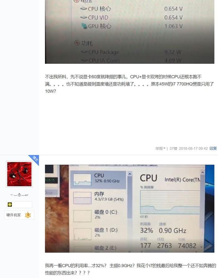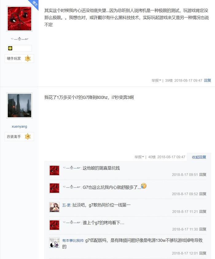 也有其他网友称:“花了1万多块钱买了一台戴尔G7游戏本,同样降频到800Hz,i7秒变奔3。”有网友跟帖解释说:“G7低配版吗?降频问题好像是电源130w不够导致的。”