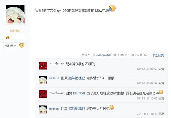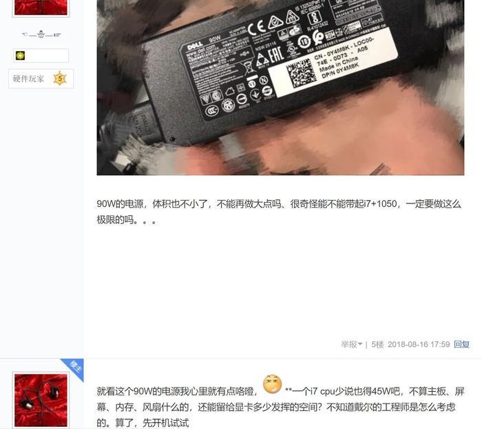 其他网友跟帖称:“我看到的7700hq+1050的笔记本都是用的120w电源”、“(戴尔)电源缩水1/4,佩服!”