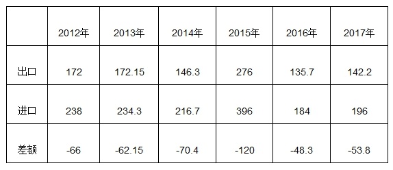 【对外贸易】突推行贸易自由化政策,迄今自由进口的商品额占进口总额的85%,自由出口的商品额占出口总额的95%。近年来突尼斯对外贸易情况如下(单位:亿美元):