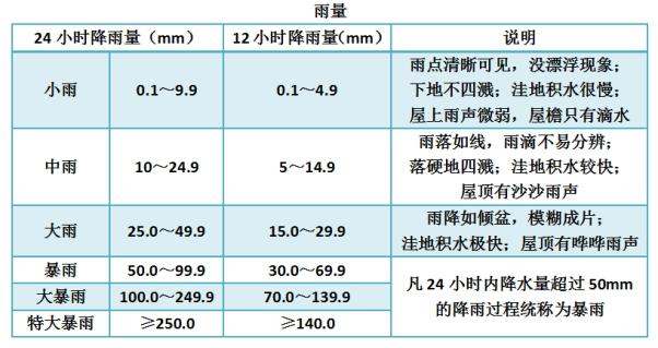在气象上通常用某一段时间内降水量的多少来划分降水强度。根据国家气象部门规定的降水量标准,降雨可分为小雨、中雨、大雨、暴雨、大暴雨和特大暴雨六种。