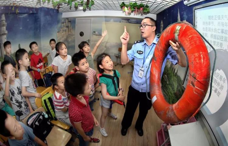 上海市公安局奉贤分局奉浦派出所民警顾晓平给暑托班的孩子讲解游泳时的安全常识。新华社记者 凡军 摄