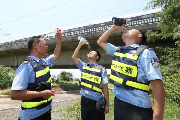 入伏以来,武汉连续多日高温。武汉火车站派出所民警罗居奇正在站内巡逻。手铐、警棍、急救包、执法记录仪、通讯电台……他背负着六七斤重的警用装备,警服完全湿透。随身携带的计步设备显示,他当天已步行超过两万步。
