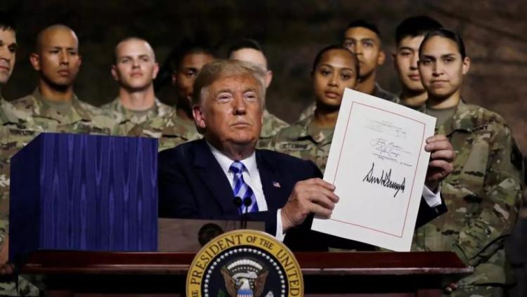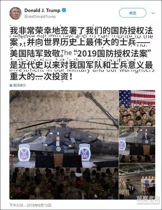 当地时间8月13日,特朗普在美国一处军事基地签署了2019年度国防授权法案,总额达到7160亿美元,增幅2.6%,是美国军费9年来的最大涨幅,创下伊拉克战争和阿富汗战争以来的新高 。