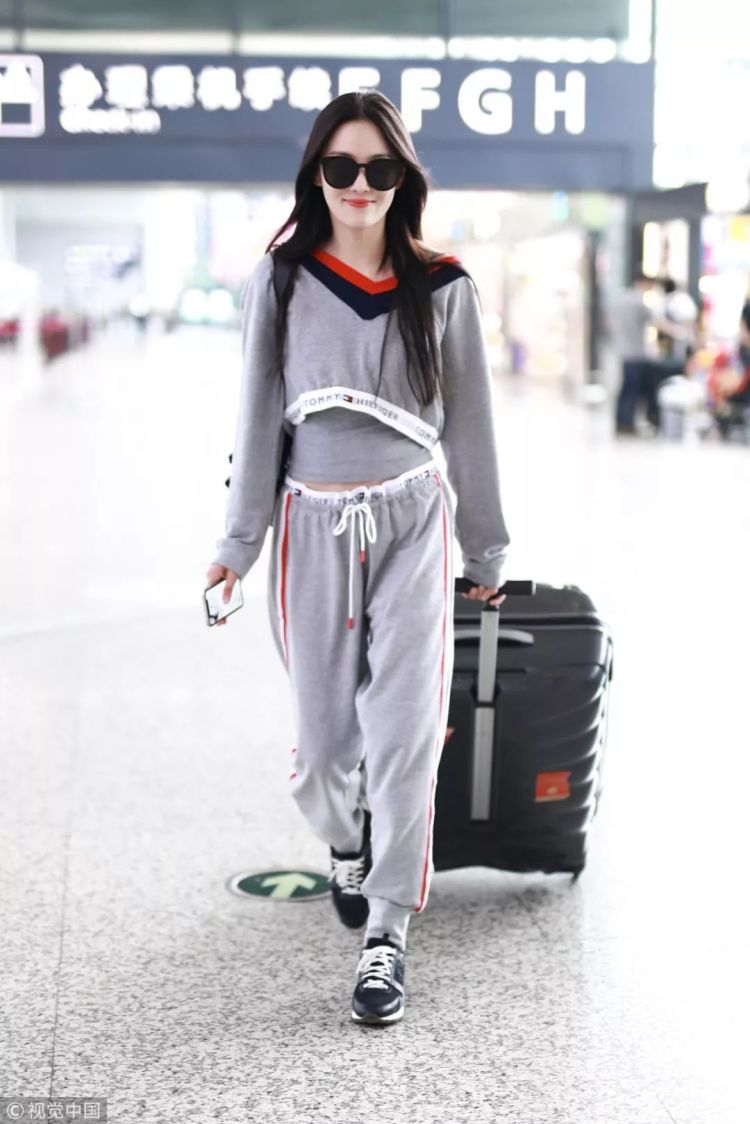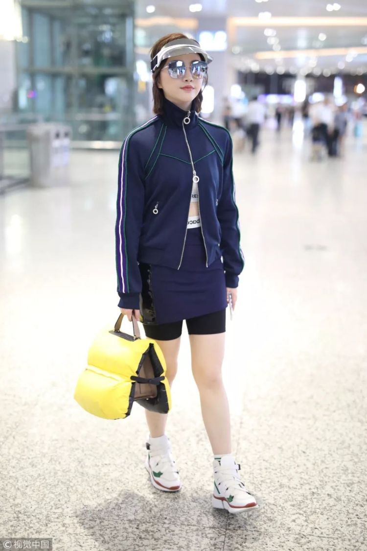 ▲张馨予身穿Tommy Hilfiger串标镶边运动套装现身机场,超短外套修饰出细腰,搭配Louis Vuitton运动鞋休闲舒适风。