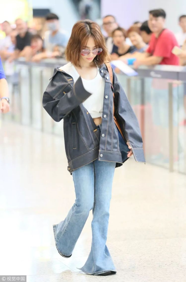 ▲廓形牛仔外套+拖地牛仔喇叭裤,上深下浅颇有层次。搭配棕色Loewe单肩包,喇叭裤型更是显腿细的神器。