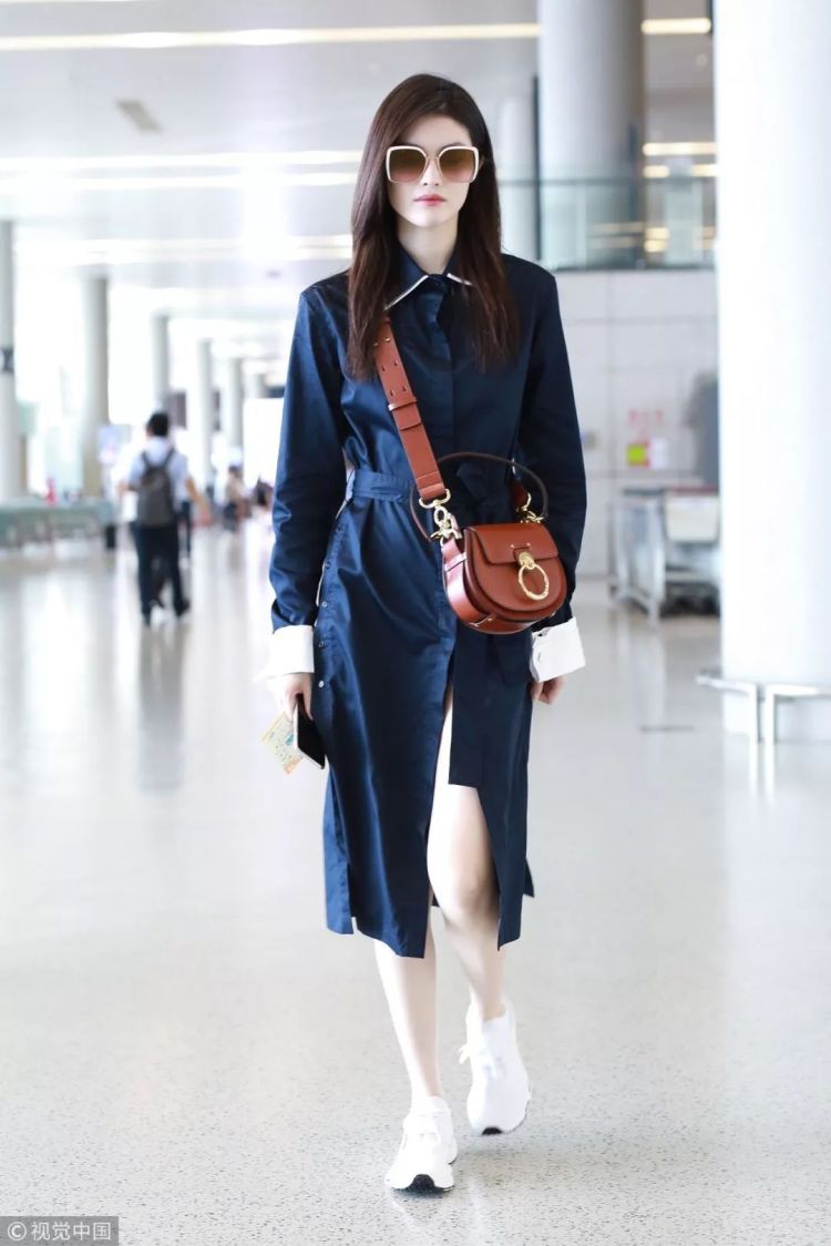 ▲何穗用藏青色衬衫裙搭配Chloé小猪包,脚踩白色运动鞋,搭配墨镜简约之余又显气场。