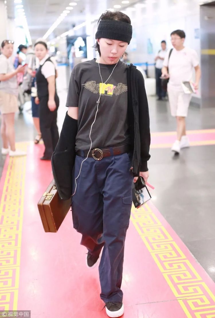 ▲黑T恤外搭长袖运动外套,下着藏青色工装长裤,还绑着毛线发带的童童看起来很“暖和”!