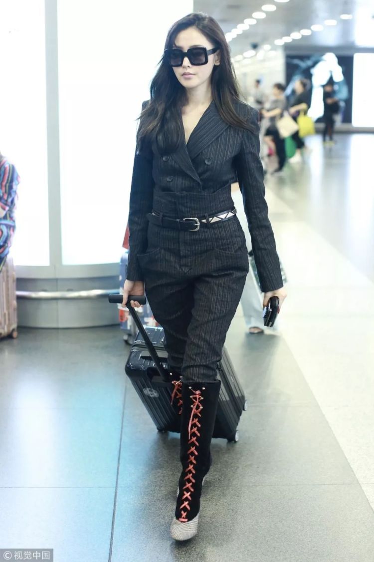 ▲深灰西装套装+绑带长靴+墨镜,走了攻气风的张天爱气场大开,干练十足。