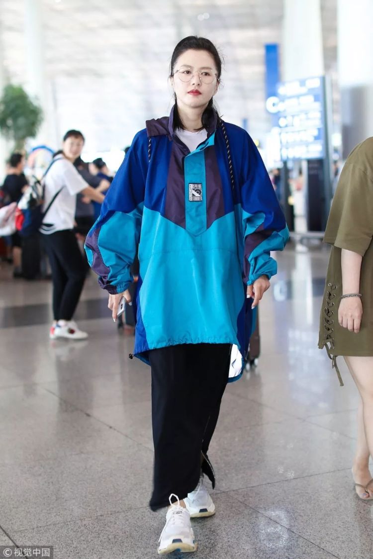 ▲谭维维延续了以往oversized风格,蓝色Balenciaga廓形冲锋衣搭配老爹鞋,中性+街头的风格让人眼前一亮。