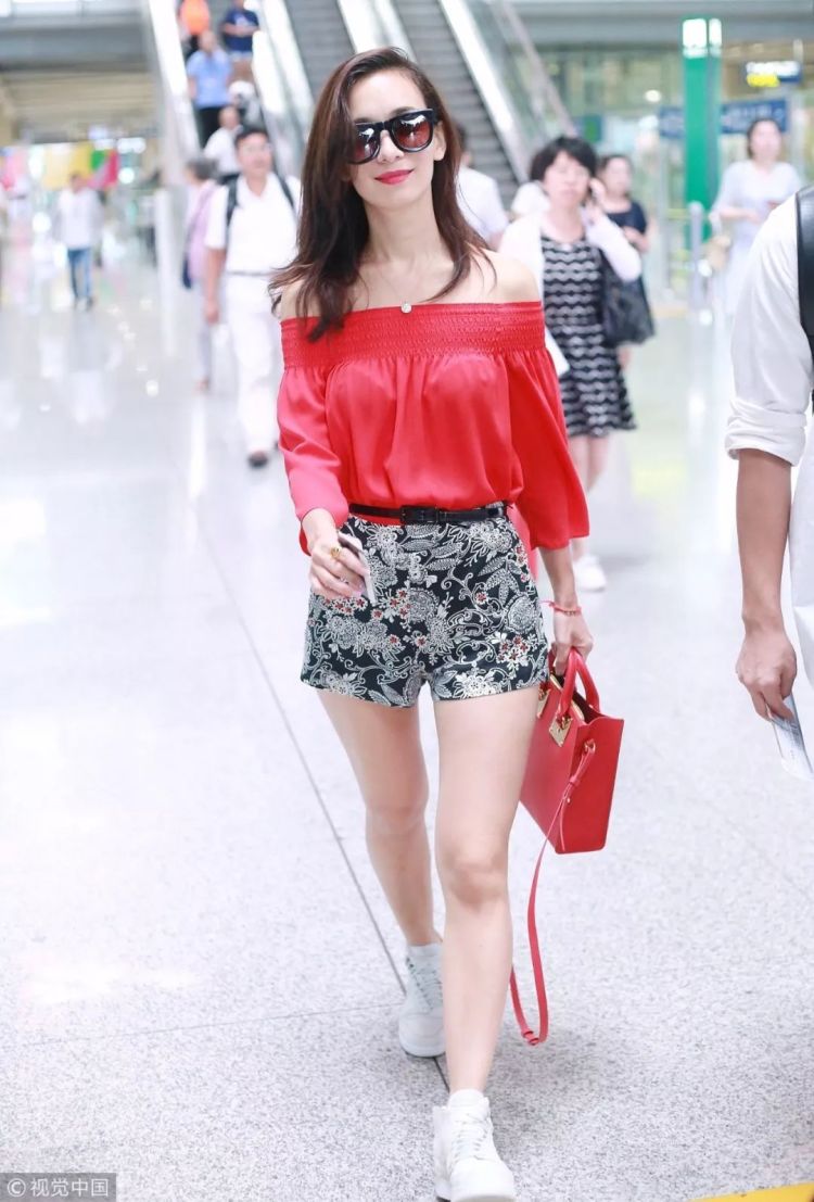▲卢靖姗身穿正红色一字肩衬衫性感成熟,和Sophie Hulme红色手袋相呼应,印花短裤独具风情。