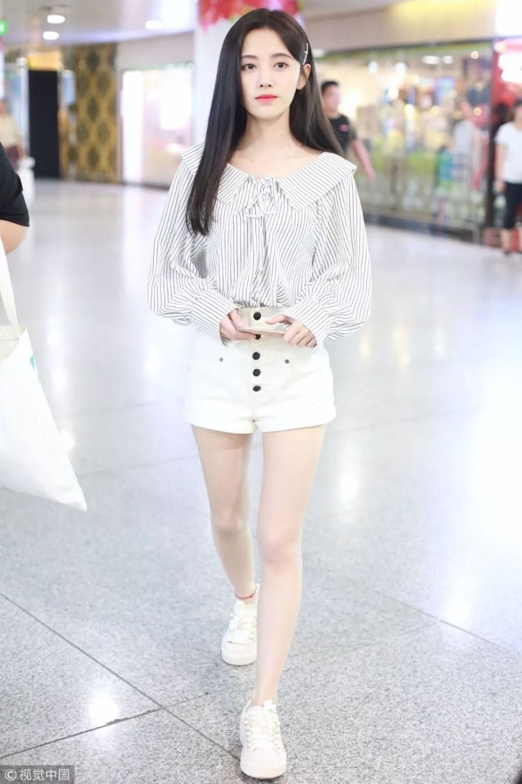 ▲鞠婧祎也是一身纯白look亮相,翻领衬衫+白色热裤清纯可爱。