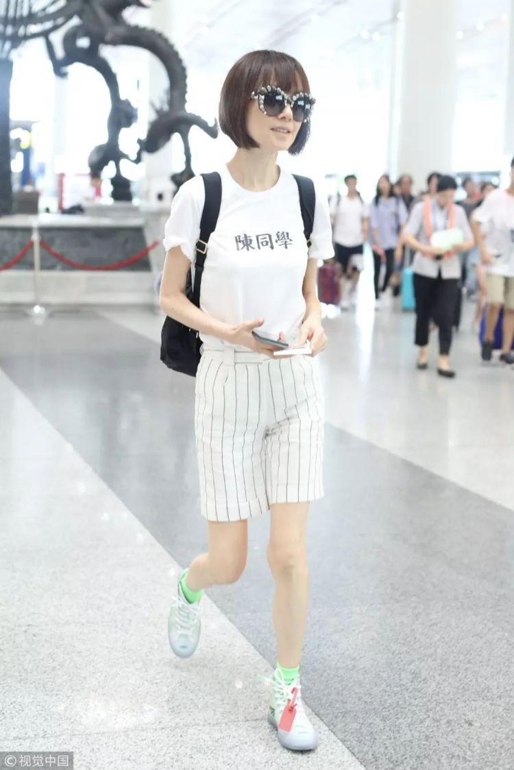 ▲鲁豫一身白色简洁清新,T恤胸前的“陈同学“印花暗藏调皮。脚上穿着Converse x Off White球鞋,紧跟潮流。