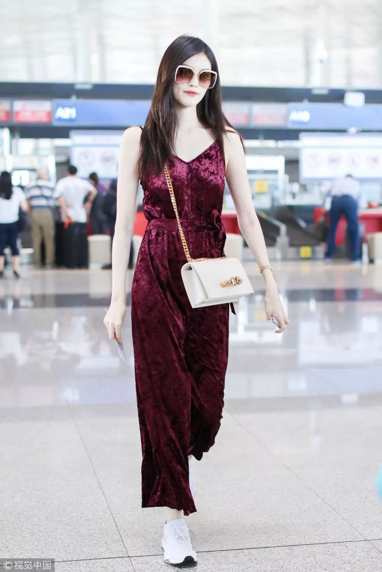 ▲何穗大胆穿着Eifini酒红色丝绒吊带连体裤,纤细的胳膊毫无赘肉令人悦目。搭配白色Alexander McQueen包和白边Fendi墨镜,高贵之外又增添大方。