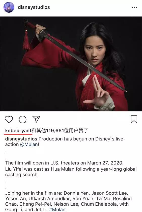 近日,迪士尼官方ins发布了真人版电影《花木兰》首张定妆照。这条ins瞬间成为爆款,吸引了包括科比在内的近12万网友点赞、留言。