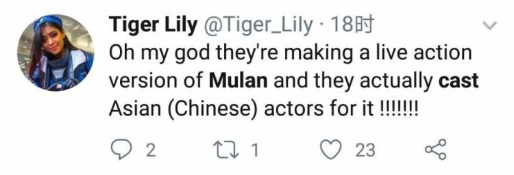 网友Tiger Lily:天哪《花木兰》要拍真人版了而且他们真的找了亚裔(华裔)演员来演!!!!!!