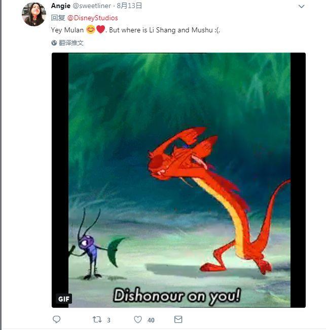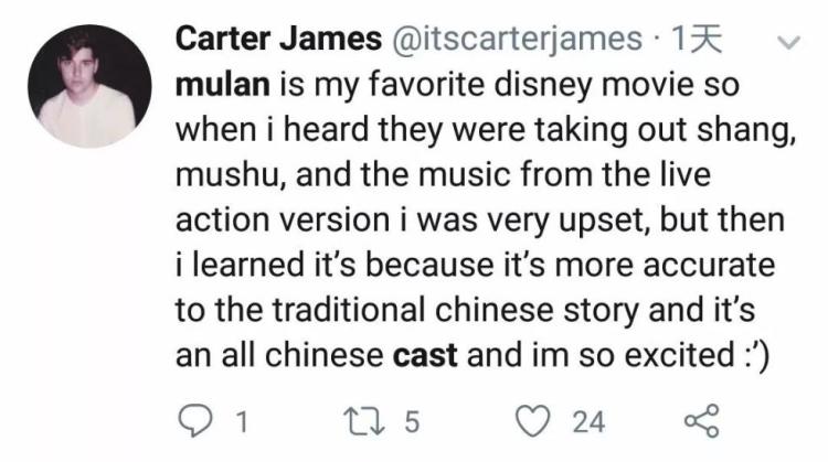网友Carter James:《花木兰》是我最喜欢的迪士尼电影,所以我听到Shang和Mushu的角色被拿掉,原版的音乐也取消了,还挺心塞的。不过后来我意识到,这样做更符合这个中国古代故事的设定,而且演员都是华裔,我超开心。