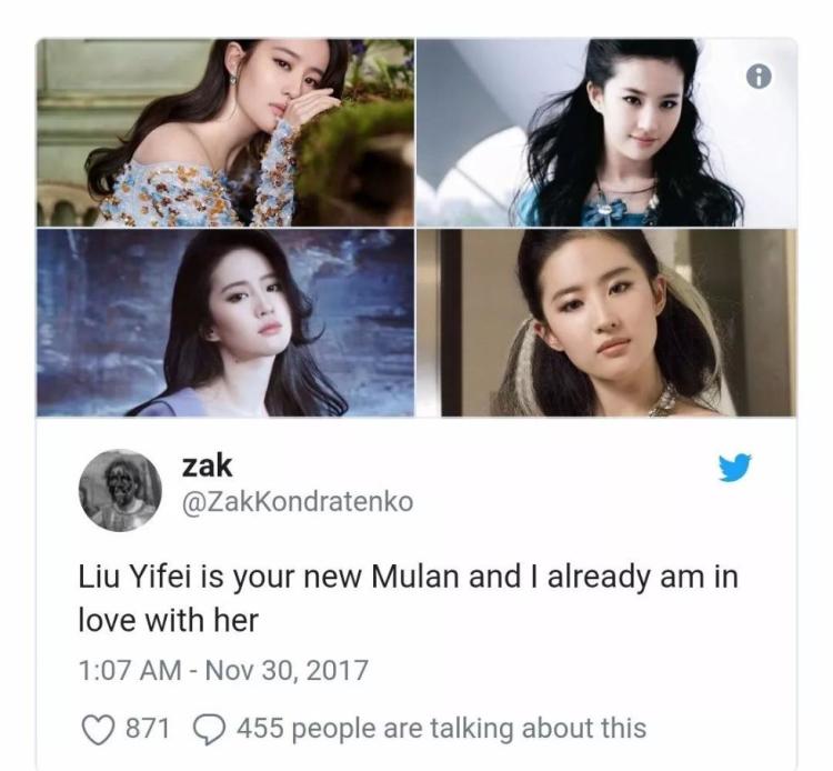 网友Zak:刘亦菲是你们的新木兰,我已经爱上她了。