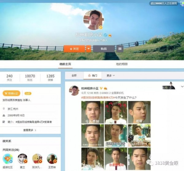 小吴说自己才18岁,对着突如其来的关注有点吃惊,自己的表情包上了热搜,自己的微博账号也火了,被人搜出来转发后,几个小时里就多了上万的粉丝。
