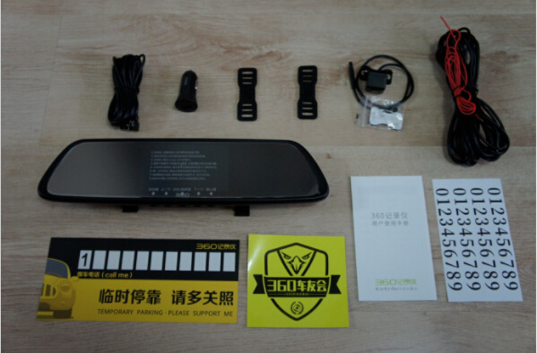 随机配件比我想象的多,毕竟这是双镜头版。除了后视摄像头、两根数据连接线外,还有点烟器电源(可惜单口)、两根硅胶绑带、以及停车告示卡。