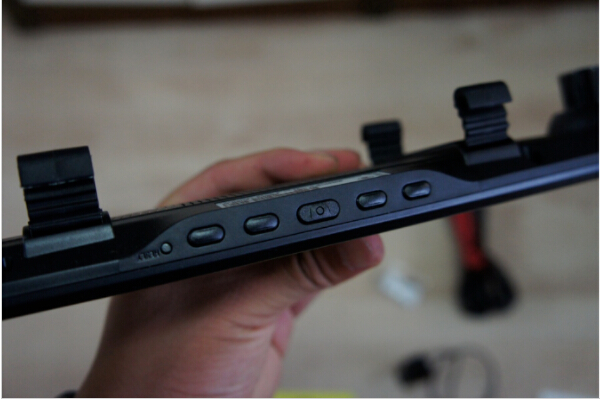 那按键呢?藏在机身下沿,伸手可摸。共有六个实体键,中间凸起的是电源开关,也用来锁屏,两侧的四个按键在使用过程中,功能以屏幕上的注释为准。最右侧有个很小的RESET键,用来系统复位,如果你忘记WiFi密码了,它就有用了。
