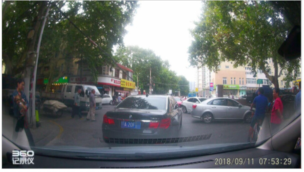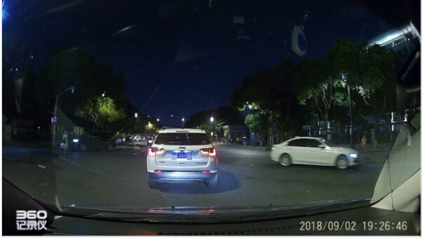 这是晚上7点半拍摄的画面,环境比较复杂,大视角摄像头完整的捕捉了不同方向的影像。前方牌照即便不放大,也能看得清楚。