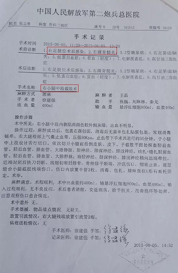 据张志勇介绍,手术后,他右脚的伤口处一直不见好转,为此,他曾先后3次到榆树市人民医院住院治疗。之后,他又两次前往吉林大学第二医院住院治疗。2015年1月20日,吉林大学第二医院诊断为:“右足内侧楔骨切开复位内固定术后,急性化脓骨髓炎。”2015年6月2日,张志勇来到中国人民解放军第二炮兵总医院治疗。同年6月5日,该院为他进行了右小腿中段截肢术。