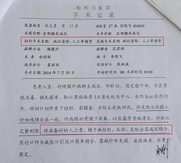 经该院骨科接治,张志勇住院后被诊断为右侧糖尿病足、破溃感染。张志勇告诉记者,自己受伤前,右脚明明是好的,该院骨科主任由明阁却称病情很严重,需要手术治疗。实施的手术名称是病灶清除、人工骨植骨。入院后,张志勇签了《植入性医用器材使用知情同意书》。