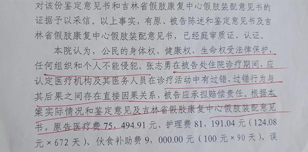据记者调查,2016年8月8日,吉林大众司法鉴定所出具了司法鉴定意见书,认为被鉴定人张志勇在住院期间,榆树市人民医院3份病历记录混乱,对现病史、受伤时间叙述前后矛盾,诊断及治疗不当引发骨髓炎(截肢),应承担全部责任。榆树市人民医院对张志勇诊断、治疗不当与引发骨髓炎(截肢)有直接因果关系,其过错的参与度为100%。被鉴定人张志勇右下肢小腿中段截肢造成6级伤残。