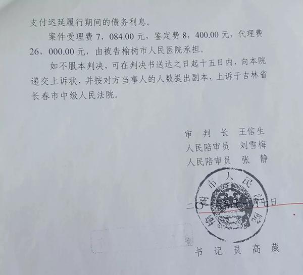 榆树市人民法院作出一审判决后,榆树市人民医院没有提起上诉。据张志勇说,医院履行了人民法院的判决。