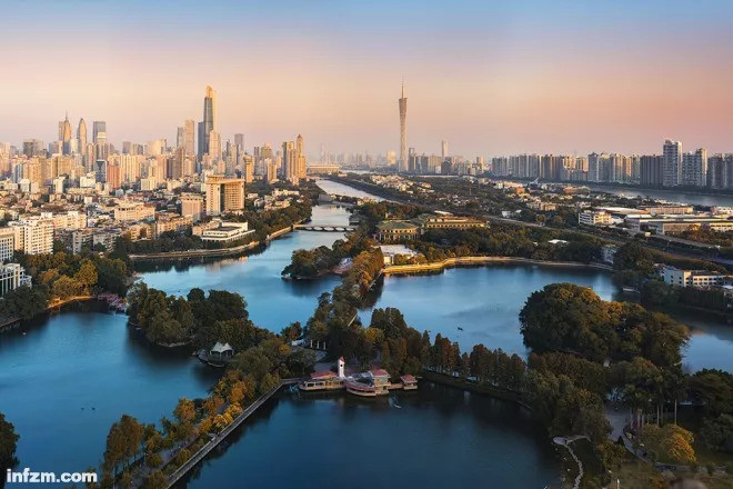 广州今日,旧城和新城的无缝衔接,前景为老城区越秀区东湖公园,远景珠江北岸为天河区珠江新城CBD,南岸为海珠区琶洲新区。(视觉中国/图)