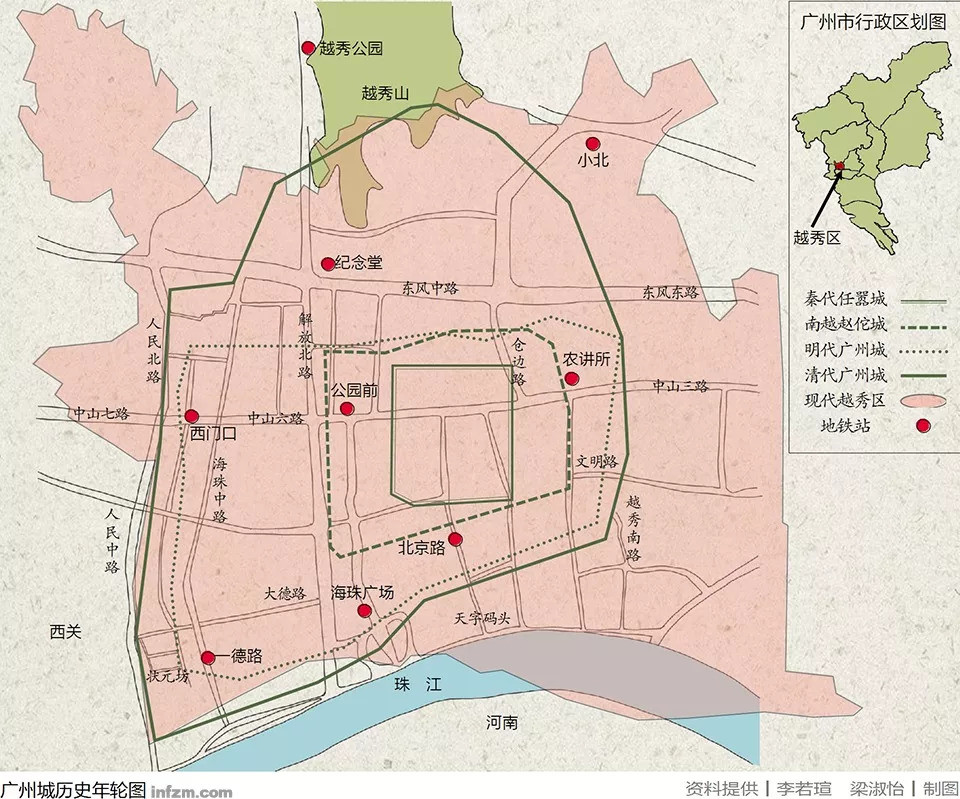 自公元前214年秦始皇派任嚣、赵佗率领50万大军统一岭南、建造番禺城(任嚣城)起至今,在长达2200多年的历史中,这座城市在不同的时代呈现着不同的风貌——从海水汤汤浮丘点点,到沙洲堆积陆地成片;从濒临海洋到远离海洋,从弹丸之城到国际都市……将广州历代的城市地图叠加在一起,可以清晰地看到一圈圈不同时代的城市边界形成的年轮,年轮的中心是最早的广州城,而一圈圈边界是每一次城市扩张留下的痕迹,两千多年来,广州就像一棵树那样生长着,将历史与文化沉淀在层层年轮里。