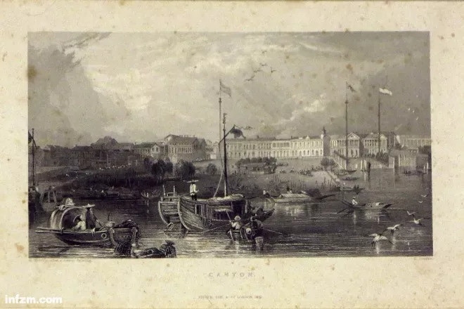 描绘广州十三行的铜版画,1835年作,由陈滢女士捐赠,现藏于广东省博物馆。(视觉中国/图)