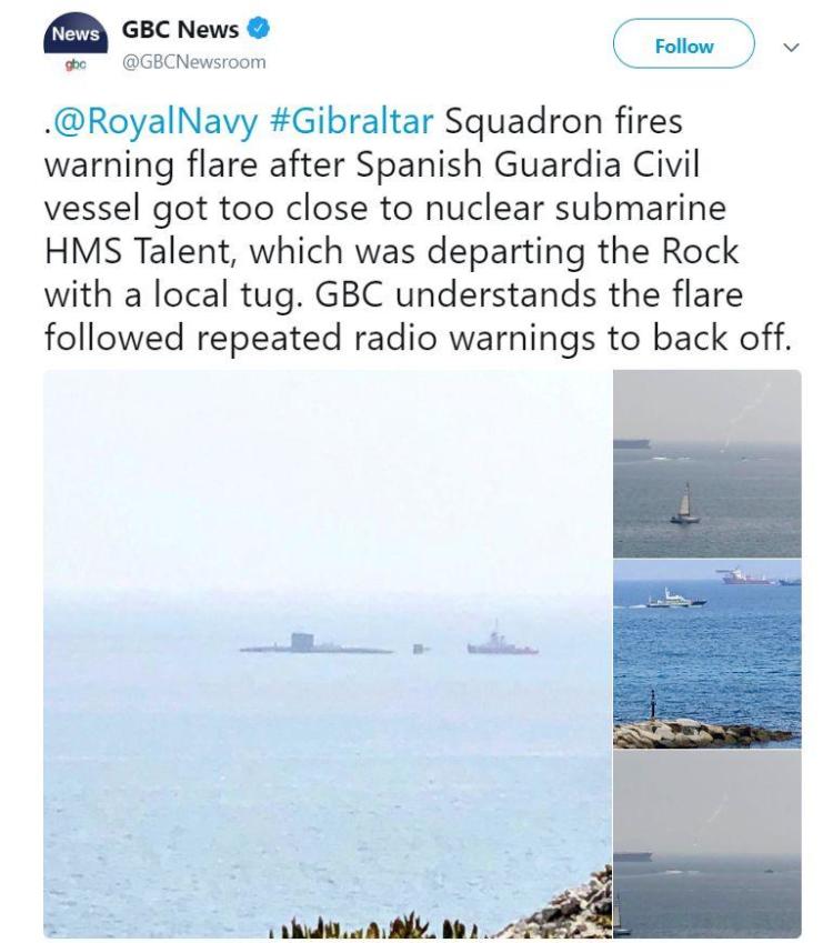这不,这两天西班牙的海警与英国海军在直布罗陀险些发生了军事冲突。根据英国媒体的报道,当时刚刚在直布罗陀补充完“战斧巡航导弹”的英国核动力潜艇“天才”号,认为西班牙海警的船支过于靠近自己,于是这艘英国海军的王牌潜艇先是多次通过无线电发出警号,之后又发射了警告信号弹。