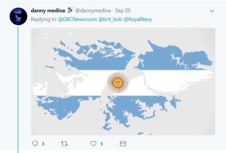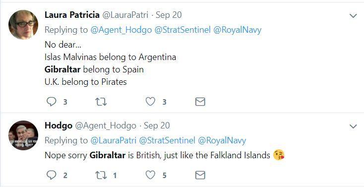 两国网民的互撕也延续到了另一个境外主流社交平台Twitter上。其中下图中的这位西班牙网民就说“直布罗陀是西班牙的,就像马尔维纳斯群岛是阿根廷的”;一位英国网民则反怼说“不不,直布罗陀和福克兰群岛都是英国的”。