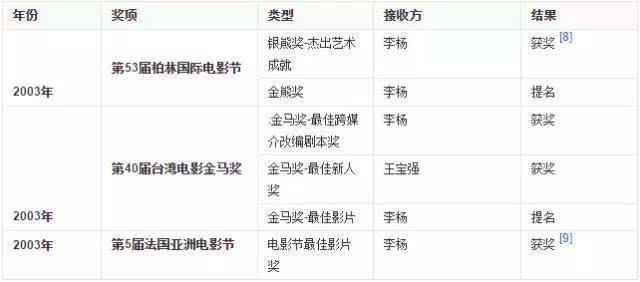 电影却获奖无数,席卷了各大电影节30多个奖项。尤其是2003年2月在柏林电影节,《盲井》在柏林电影节上,击败了张艺谋的大片《英雄》。获得“最佳艺术贡献银熊奖”。