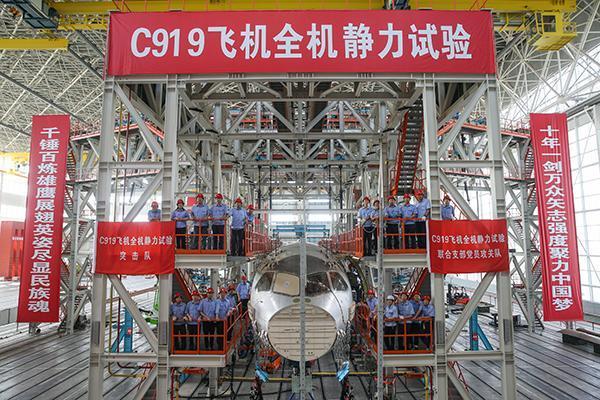 2018年7月12日下午,中国商飞公司发布消息称,C919大型客机全机2.5g机动平衡工况极限载荷静力试验在航空工业强度所上海分部取得圆满成功。