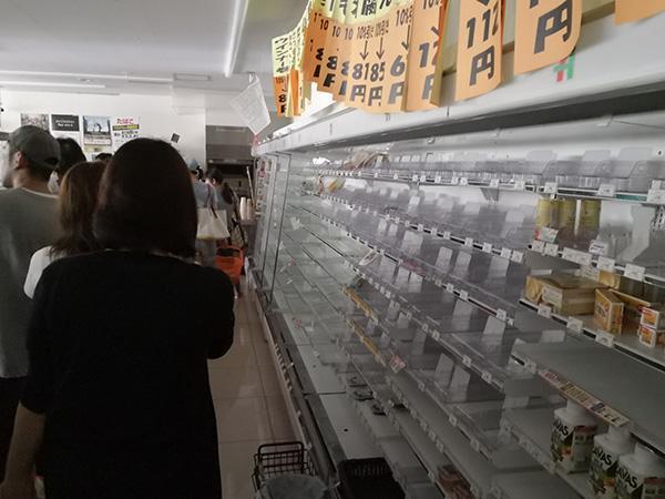 地震过后,北海道灾区出现了生活必需品短缺的情况。据新加坡《联合早报》报道,北海道首府札幌市到处有民众在商店外大排长龙购买必需品,不少地方的货物被抢购一空。有部分超市比平常开门要晚,民众长龙达100米长。有网民形容,地震过后的札幌像是“难民城”,许多居民到超市和商店抢水、食物,架上所有贩卖的食物全被抢光。