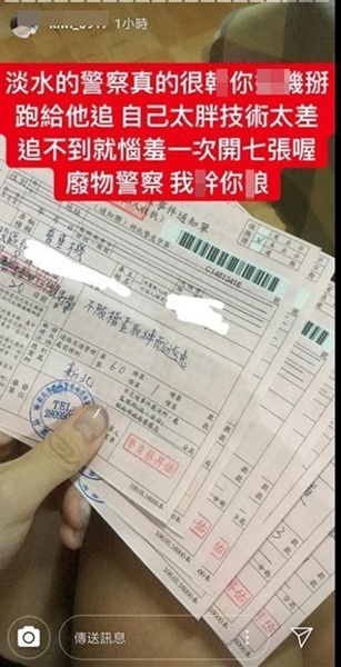 据悉,该名女子绰号“凯蒂”,因身材姣好在脸谱网有多达4千多名粉丝,近日她在个人IG帐号中贴出7张罚单照,并痛骂:“淡水的警察真的XX,跑给他追,自己太胖技术太差,追不到就恼羞成怒一次开七张罚单?废物警察我XX娘!”